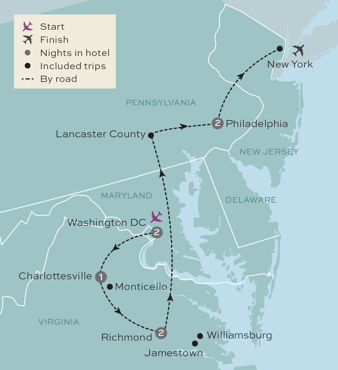 We’ll begin in Washington to discover the iconic White House and the National Mall, head south along the Blue Ridge Mountains of Virginia to Charlottesville, the home of Thomas Jefferson. We’ll move on to the buzzing city of Richmond, the capital of the Confederacy during the Civil War and discover Jamestown, where the first British settlement was established in 1607. You'll visit an Amish community in Pennsylvania and stop in Philadelphia, where the Declaration of Independence was signed in 1776, and home of the Liberty Bell, Independence Hall and the Philly cheese steak. We'll end our trip with an exciting three night stay in New York City.