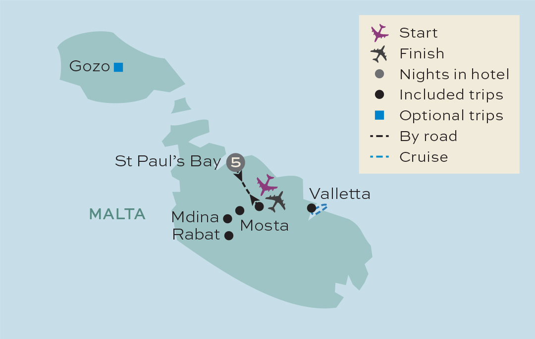 Today is a free day, so it's entirely up to you how you spend it. If you're so inclined, join us on an optional excursion to the pretty green island of Gozo, just a short ferry ride away. During the crossing, we'll pass the small island of Comino and on top of one of the rugged cliffs you'll see the Santa Maria Fort, which appeared in the movie 'Count of Monte Cristo'. After stepping ashore on Gozo, we will explore some of the island's highlights. We will visit the shrine of Ta'Pinu, a church set amid beautiful countryside, and Dwejra, where an inland lagoon of saltwater is linked to the sea by a small arch-like tunnel. If time allows, you can take an optional cruise on the lagoon and through the tunnel before we continue to Admiral's Rock. Better known as Fungus Rock, a unique plant with medicinal properties is said to have once grown here. Around lunch time, there's a chance to shop for local handicrafts at a crafts village before the tour continues to the medieval city of Victoria. Here we will explore on foot and visit the Cittadella, a walled city within the city, which has recently been restored. You'll enjoy breathtaking views across the island from the city walls here. Finally, we'll make a stop at the Qala Belvedere to take photos of some more incredible view towards the coast, with the islands of Malta and Comino in the distance.