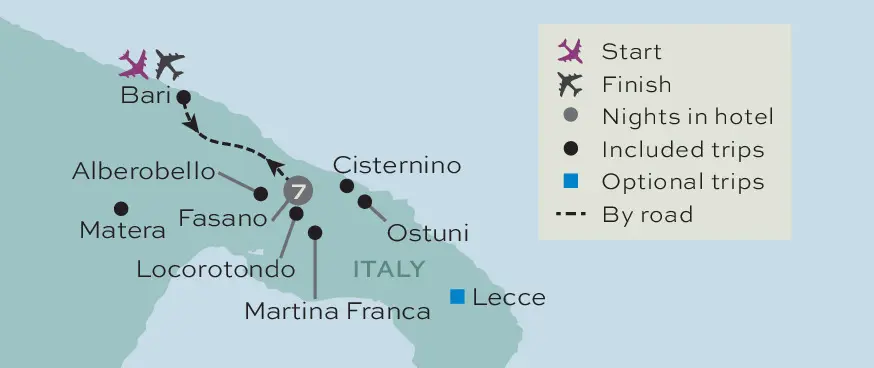 You've a free day today to relax at the hotel. This evening, if you'd like to experience the Italian way of life, be sure to join our optional excursion to Monopoli. Departing late afternoon, we'll drive to Monopoli, a pretty coastal town with a delightful medieval centre and seafront promenade. It's the perfect place to enjoy an aperitif and well known for the Baroque Monopoli Cathedral featuring a tall bell tower. You'll have free time here to explore and enjoy dinner in one of the inviting little restaurants. You could even treat yourself to some delicious ice cream for dessert!
