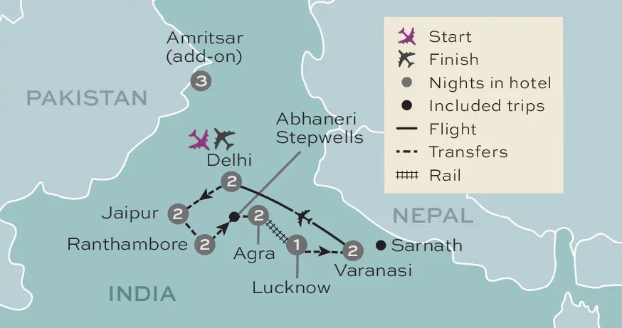 Enjoy an incredible journey through India’s very best cultural, religious and natural sites. Starting with the heady scents of Old Delhi’s vibrant bazaars and food stalls, we’ll move on to Jaipur and its mix of fortresses, palaces and busy street markets. In Ranthambore National Park we'll spend time looking out for the local wildlife, including the beautiful but elusive tiger. We then travel on to Agra, home of the Taj Mahal which we will visit, as well as spending time at Agra Fort - a truly impressive site to explore. There’s also time in Lucknow, which is well known for its gardens and monuments and during our visit we'll enjoy an immersive experience at an 8th generation fragrance house. We'll also enjoy a cultural fix with visits to temples and the holy city of Varanasi, where we’ll sail along the Ganges at dawn – a real wow moment on this tour. We'll then head to Amritsar for a two-night stay. A guided tour of the simply stunning Golden Temple is included.