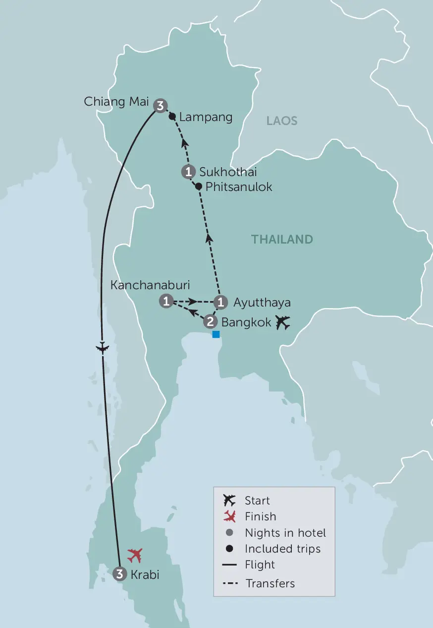 This adventure through Thailand begins as you discover the exciting city of Bangkok by tuk-tuk, where dazzling sights include the Grand Palace and the Wat Pho temple, home of the incredible Reclining Buddha. We will visit Kanchanaburi, home of the Bridge over the River Kwai. You'll then travel northwards to discover the UNESCO-listed ruins of Ayutthaya and in the company of a local history expert, you can admire some of Thailand's finest architecture at Sukhothai. You'll learn more about local customs in Lampang and Chiang Mai. Highlights here include a private blessing ceremony with monks and a visit to an elephant rehabilitation centre. The rest of your holiday is spent at the coastal resort of Krabi so spend days of relaxation on the beach.