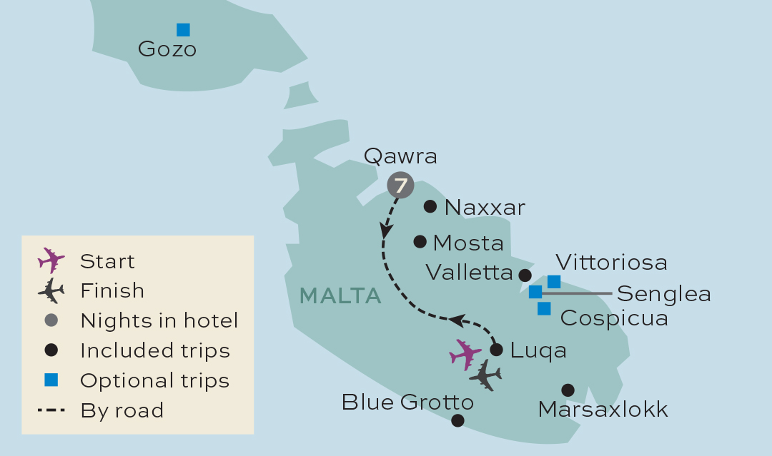 Today is free for you to explore at your leisure. Alternatively, there is an optional excursion available. In the morning, we'll travel to Cirkewwa in the north of Malta where you'll board a ferry for a short crossing to the island of Gozo. You'll notice that Gozo is much greener than Malta and has certain differing characteristics. On arrival, we will be met by a Local Guide and start our tour that includes a visit to shrine of Ta' Pinu. This important church is set in a stunning location on the edge of a ridge in open countryside, and provides beautiful views of the surrounding area. Another stop is the area known as 'Dewjra'. Here, you'll explore interesting geological sites including Dwejra Bay and the Inland Sea – a lagoon of seawater accessible to the open sea via a small tunnel through the cliff. Another of Dwejra's geological delights is the Admiral's Rock or as it is better known, Fungus Rock, a special plant is said to grow here which has various medical cures. We will be stopping off along the journey for lunch and to spend time wandering through the Craft villages on the island. where you can view local handmade pottery, mouth-blown glass, Gozo lace and silver filigree. Ideal if you want to pick up a souvenir. There will be a short walk through the busy little city of Victoria, known locally as Rabat and the Cittadellla - a small walled city within the city, where only a small number of families still live. Upon return to the ferry port of Gozo, we will pass through some small villages, and if time allows, stop at Qala Belvedere where there is an amazing scenic view of the landscape cascading down to the coast, with the smallest island of Comino in the distance. Our tour will then head back to the ferry for our return to Malta and transfer back to the hotel. Meals included: B.jpg?format=webp)